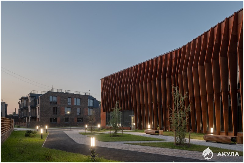 Физкультурно-оздоровительный комплекс спроектирован именитым архитектурным бюро Остоженка. Фасад ФОКа выполнен из редчайшей атмосферостойкой стали Cor-Ten — материала, который отличается высокой прочностью и долговечностью.