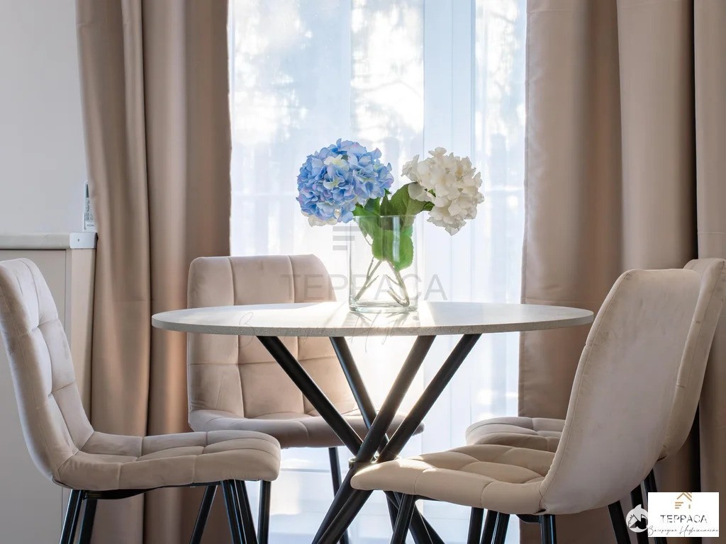 Мебелирован, мягкой мебелью Hoff. Кухонный гарнитуром сo встроенной техникой (холодильник, газовая плита, посудомоечная машина, духовой шкаф, вытяжка). В гостиной кондиционер. Санузлы оборудованы современной сантехникой (черный, хром). Портьеры и тюль в комнатах на скрытых карнизах. Стильные энергоэффективные осветительные приборы во всех помещениях. Бронедверь входная с терморазрывом.