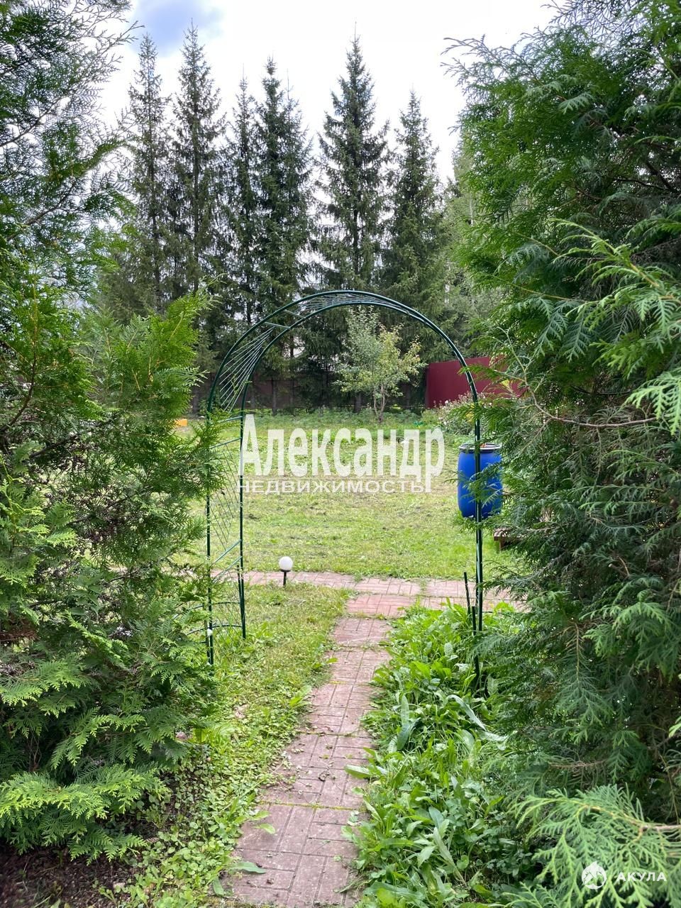 На участке выполнен дренаж, посажен газон, ухоженные ели, качели.