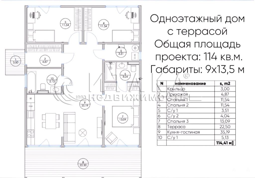 Предлагается одноэтажный каркасный дом под ключ, общей площадью 114.41 м², расположенный в современном коттеджном посёлке.