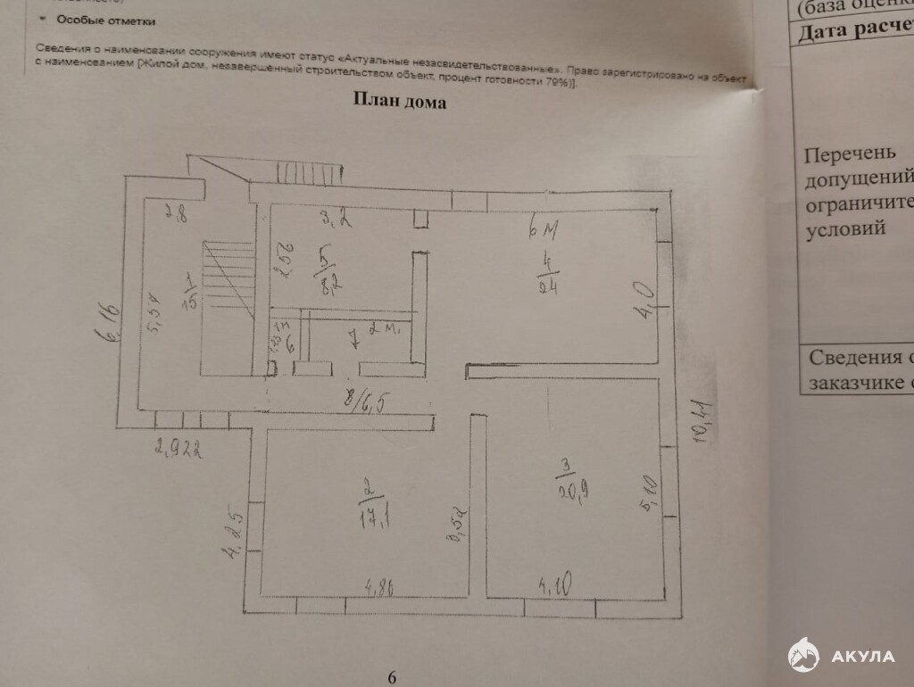 На участке расположен дом, внутри без отделки, общей площадью 121, 7 кв.м. (по документам), проектируемое назначение – объект незавершенного строительства. Дом - кирпичный, фундамент – железо - бетонная плита.