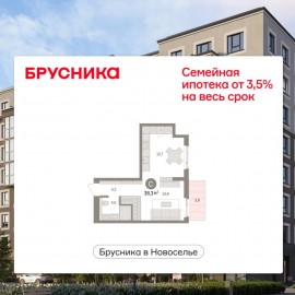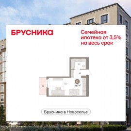 1-комн. квартира-студия от застройщика с предчистовой отделкой в ЖК "Брусника в Новоселье" на 5 этаже. Общая площадь: 34.71 кв.м., площадь гостиной 21.7 кв.м., из которых 5 кв.м. выделено под кухонную зону. Все окна выходят на одну сторону. В квартире один балкон, один совмещенный...