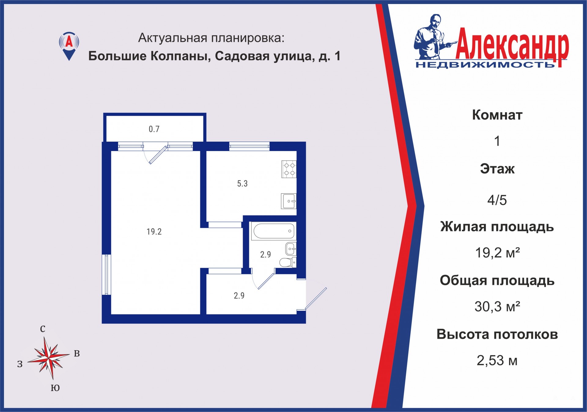 Общая площaдь сocтавляeт 30, 3 м² плюс балкон 0, 7 м², жилая площадь — 19, 2 м².