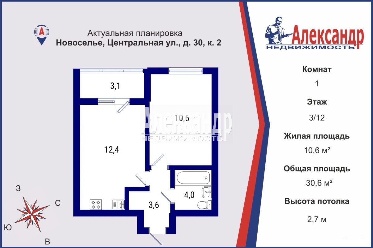 1705709 Предлагаем к продаже однокомнатную квартиру 30, 6 м²., с большой кухней 12, 4 м², . и комнатой правильной формы 10, 6 м²., в современном 12-ти этажном квартале ЖК "Полис-Новоселье".
