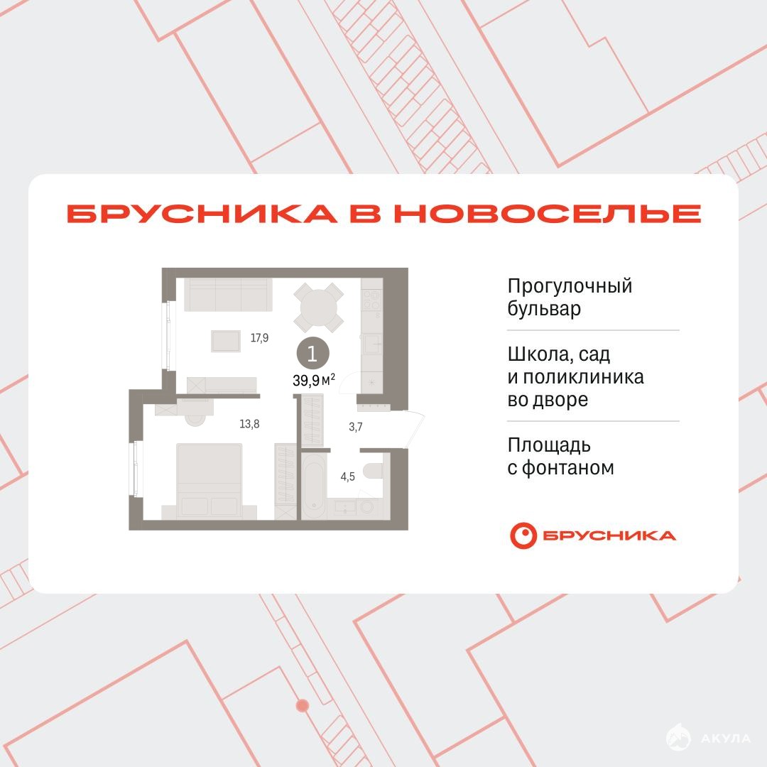 Просторная 1-комн. квартира с предчистовой отделкой в ЖК "Брусника в Новоселье" на 4 этаже. Общая площадь: 39.85 кв.м., жилая: 13.8 кв.м., площадь просторной кухни-столовой: 17.9 кв.м. Все окна выходят на одну сторону. В квартире один совмещенный санузел. Высота потолков 2.7 м.