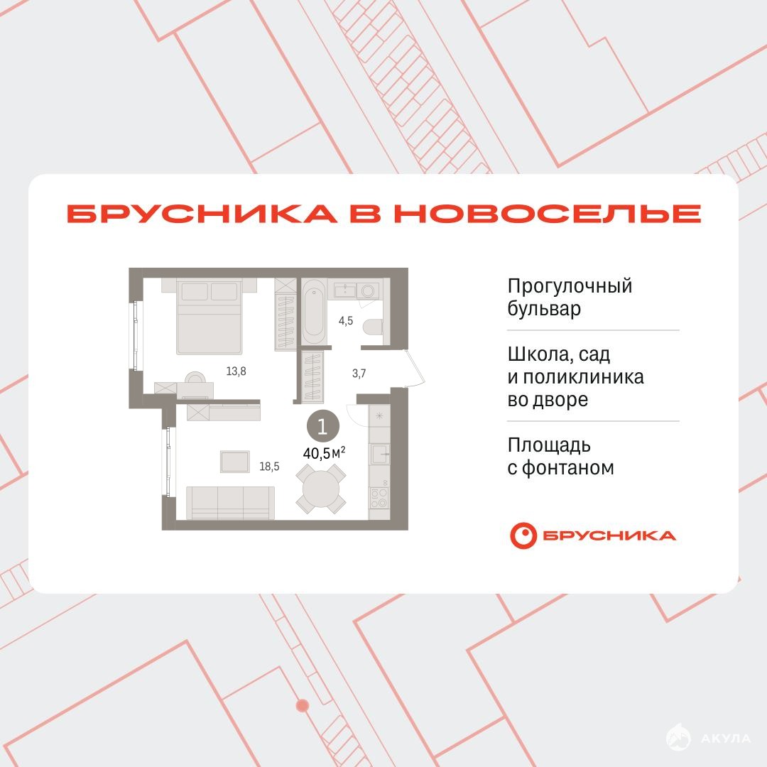 Просторная 1-комн. квартира с предчистовой отделкой в ЖК "Брусника в Новоселье" на 3 этаже. Общая площадь: 40.49 кв.м., жилая: 13.8 кв.м., площадь просторной кухни-столовой: 18.5 кв.м. Все окна выходят на одну сторону. В квартире один совмещенный санузел. Высота потолков 2.7 м.