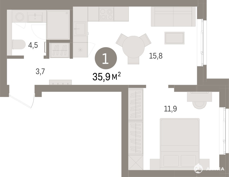 Просторная однокомнатная квартира с предчистовой отделкой в ЖК "Брусника в Новоселье" на 2 этаже. Общая площадь: 35.86 кв.м. Высота потолков 2.7 м.