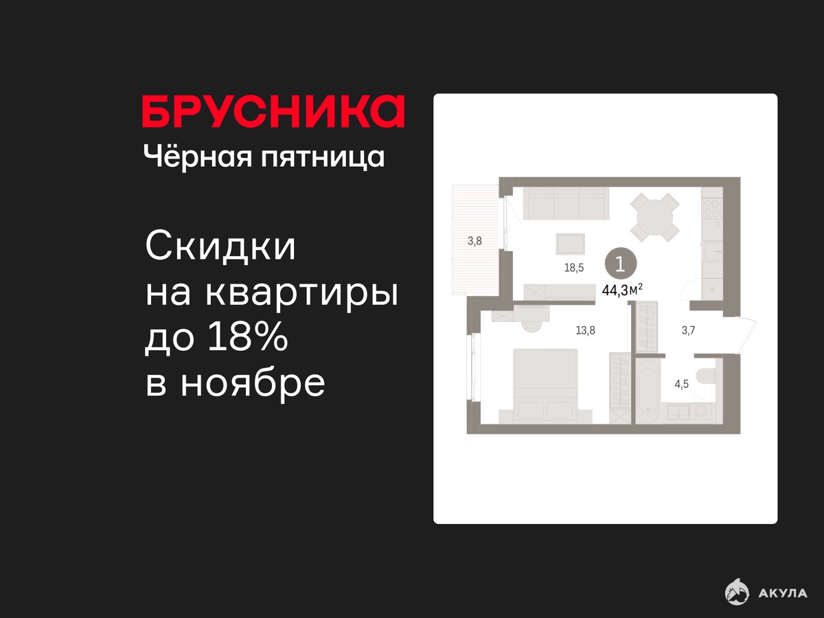 1-комн. квартира от застройщика с предчистовой отделкой в ЖК "Брусника в Новоселье" на 7 этаже. Общая площадь: 44.26 кв.м. Высота потолков 2.7 м.