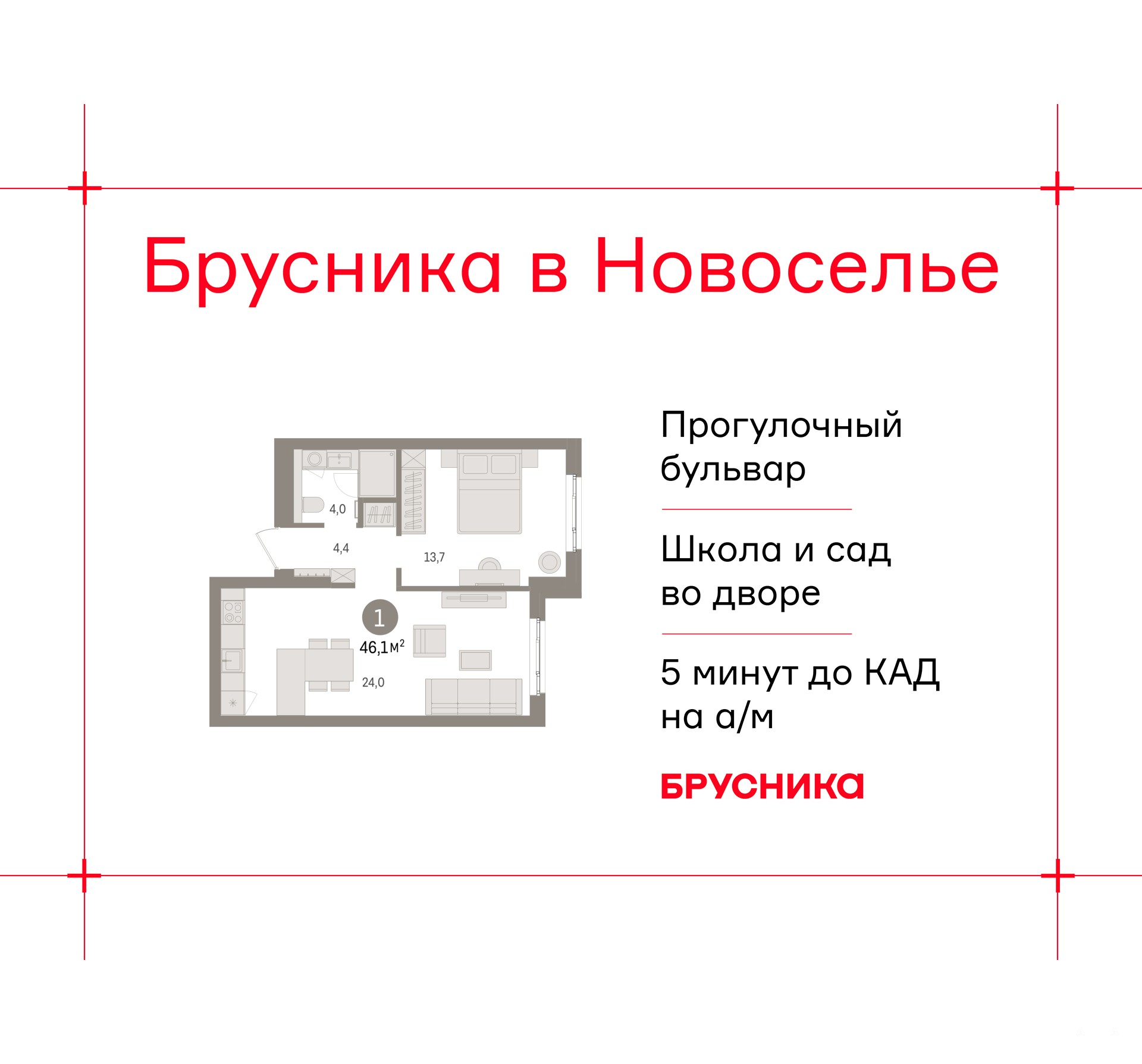 Продается 1-комн. квартира от застройщика с предчистовой отделкой в ЖК "Брусника в Новоселье" на 4 этаже. Общая площадь: 46.1 кв.м., жилая: 13.7 кв.м., площадь просторной кухни-столовой: 24 кв.м. Все окна выходят на одну сторону. В квартире один совмещенный санузел. Высота потолков 2.7 м.