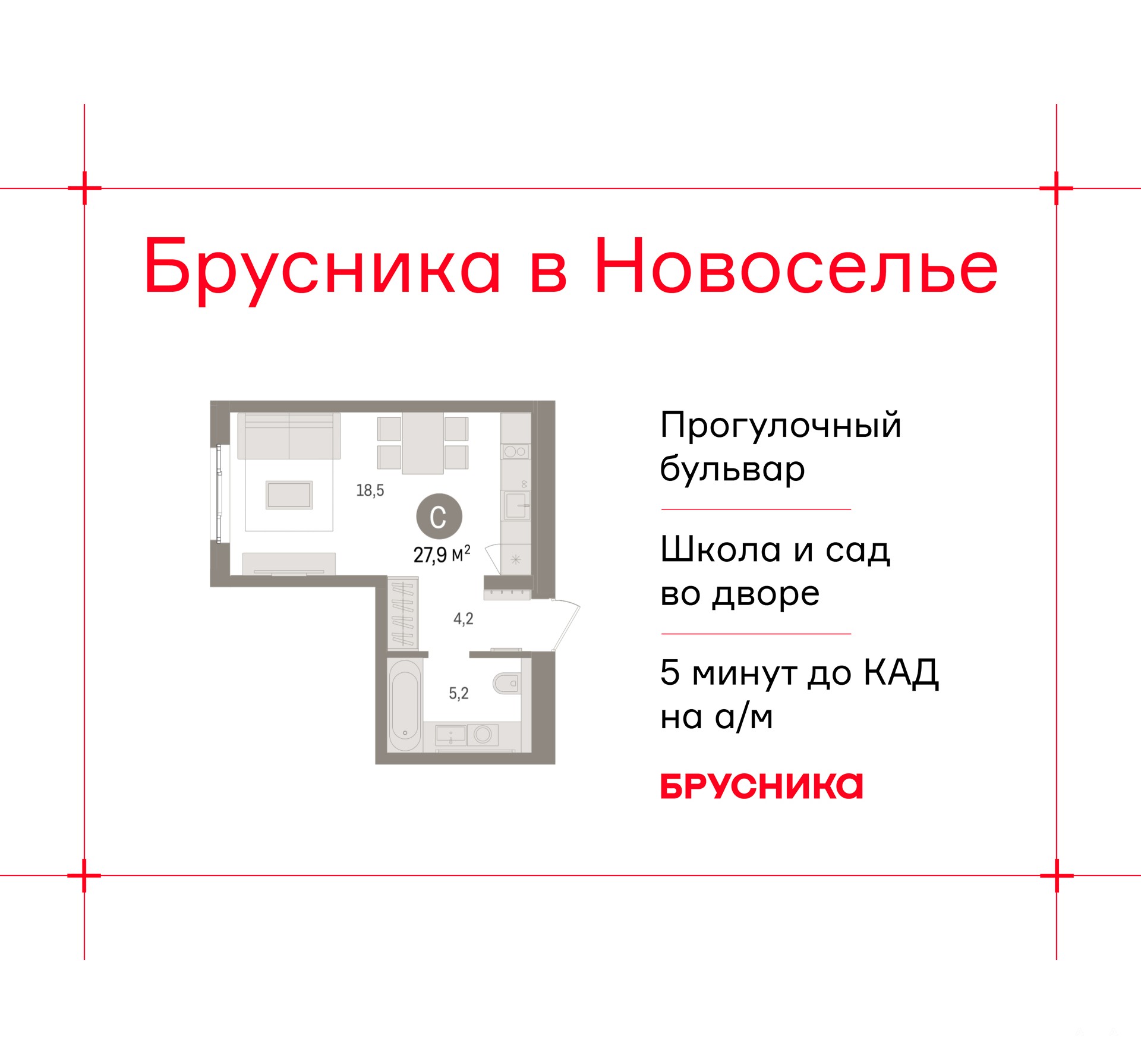 Продается 1-комн. квартира-студия с предчистовой отделкой в ЖК "Брусника в Новоселье" на 3 этаже. Общая площадь: 27.94 кв.м., площадь гостиной 18.5 кв.м., из которых 5 кв.м. выделено под кухонную зону. Все окна выходят на одну сторону. В квартире один совмещенный санузел. Высота потолков 2.7 м.