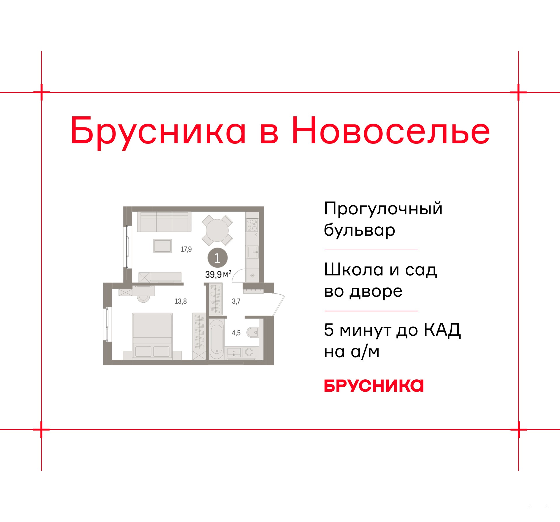 1-комн. квартира с предчистовой отделкой в ЖК "Брусника в Новоселье" на 4 этаже. Общая площадь: 39.85 кв.м., жилая: 13.8 кв.м., площадь просторной кухни-столовой: 17.9 кв.м. Все окна выходят на одну сторону. В квартире один совмещенный санузел. Высота потолков 2.7 м.