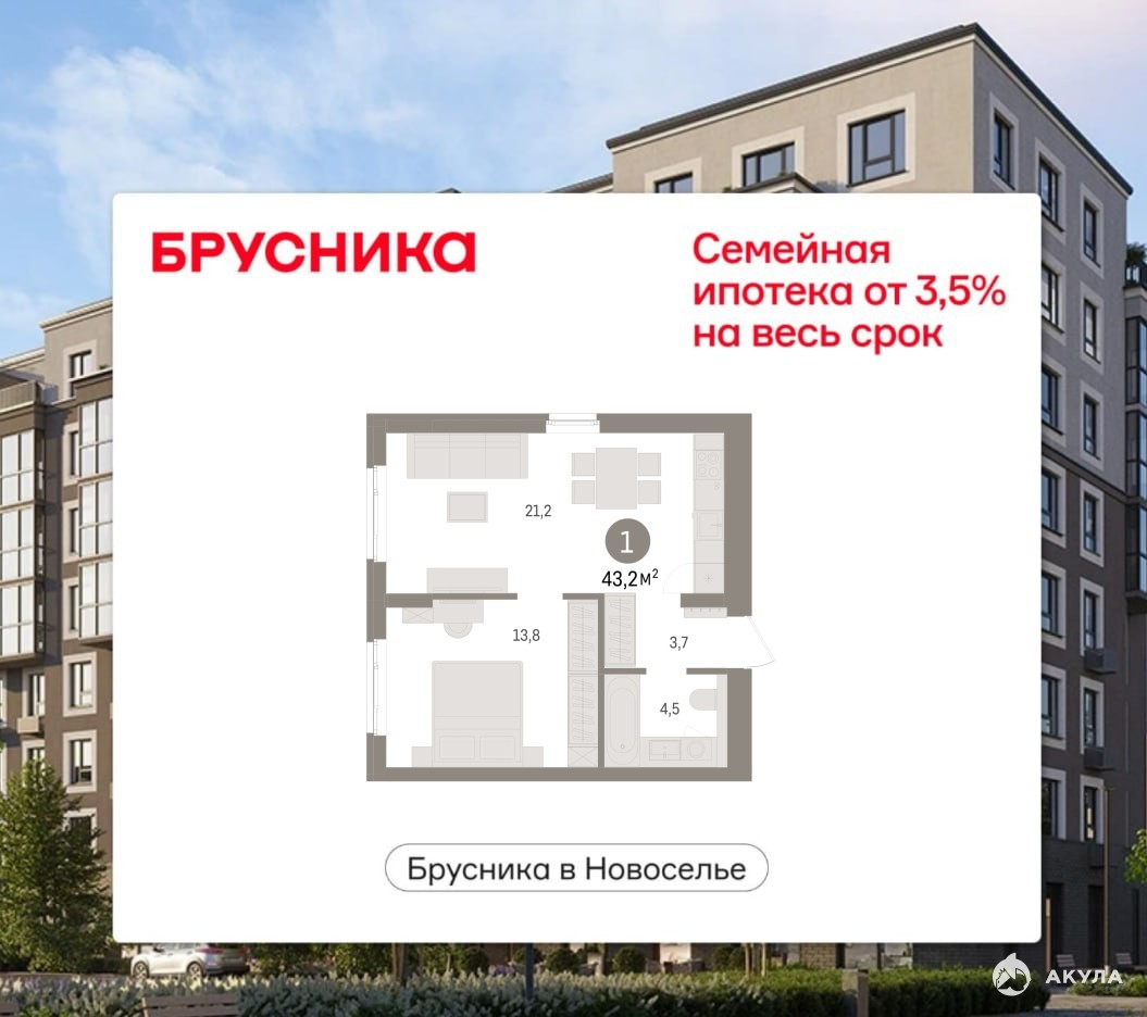 1-комн. квартира с предчистовой отделкой в ЖК "Брусника в Новоселье" на 4 этаже. Общая площадь: 43.15 кв.м., жилая: 13.8 кв.м., площадь просторной кухни-столовой: 21.2 кв.м. Угловая квартира, очень светлая, естественная вентиляция при открытии окон. В квартире один совмещенный санузел. Высота потолков 2.7 м.