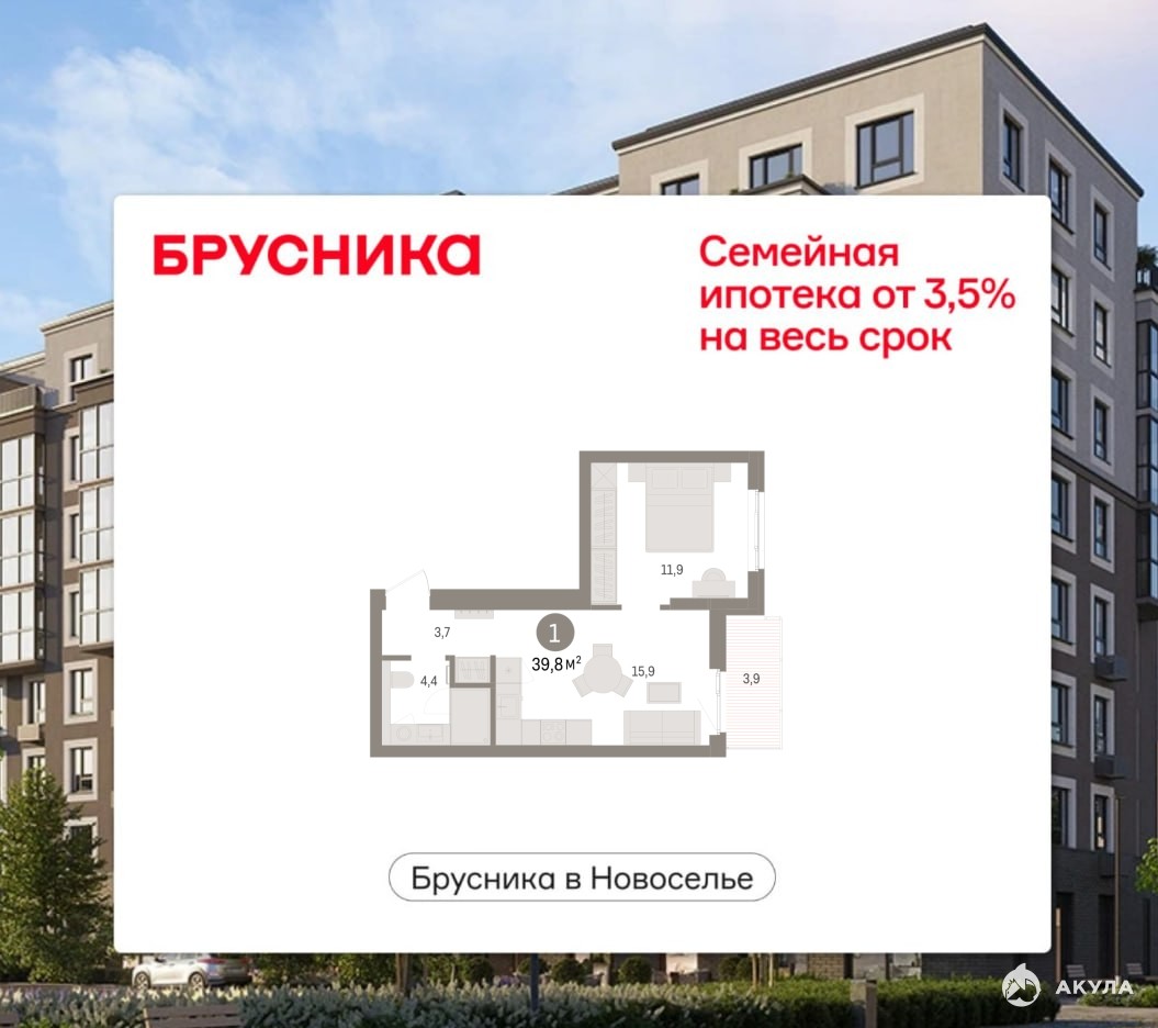 1-комн. квартира от застройщика с предчистовой отделкой в ЖК "Брусника в Новоселье" на 6 этаже. Общая площадь: 39.79 кв.м., жилая: 11.9 кв.м., площадь просторной кухни-столовой: 15.9 кв.м. Все окна выходят на одну сторону. В квартире один балкон, один совмещенный санузел. Высота потолков 2.7 м.