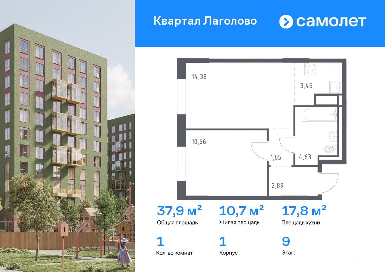 Строим кварталы для жизни с заботой о будущем. Предлагается 1-комнатная квартира комфорт-класса 37, 86 кв.м в корпусе 1 на 9 этаже, в ЖК «Квартал Лаголово»