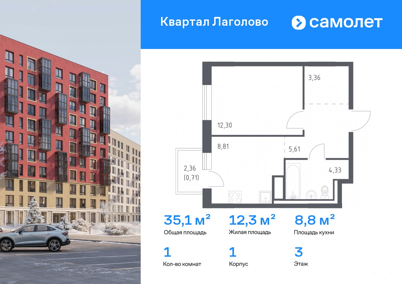 Строим кварталы для жизни с заботой о будущем. Предлагается 1-комнатная квартира комфорт-класса 35, 12 кв.м в корпусе 1 на 3 этаже, в ЖК «Квартал Лаголово»