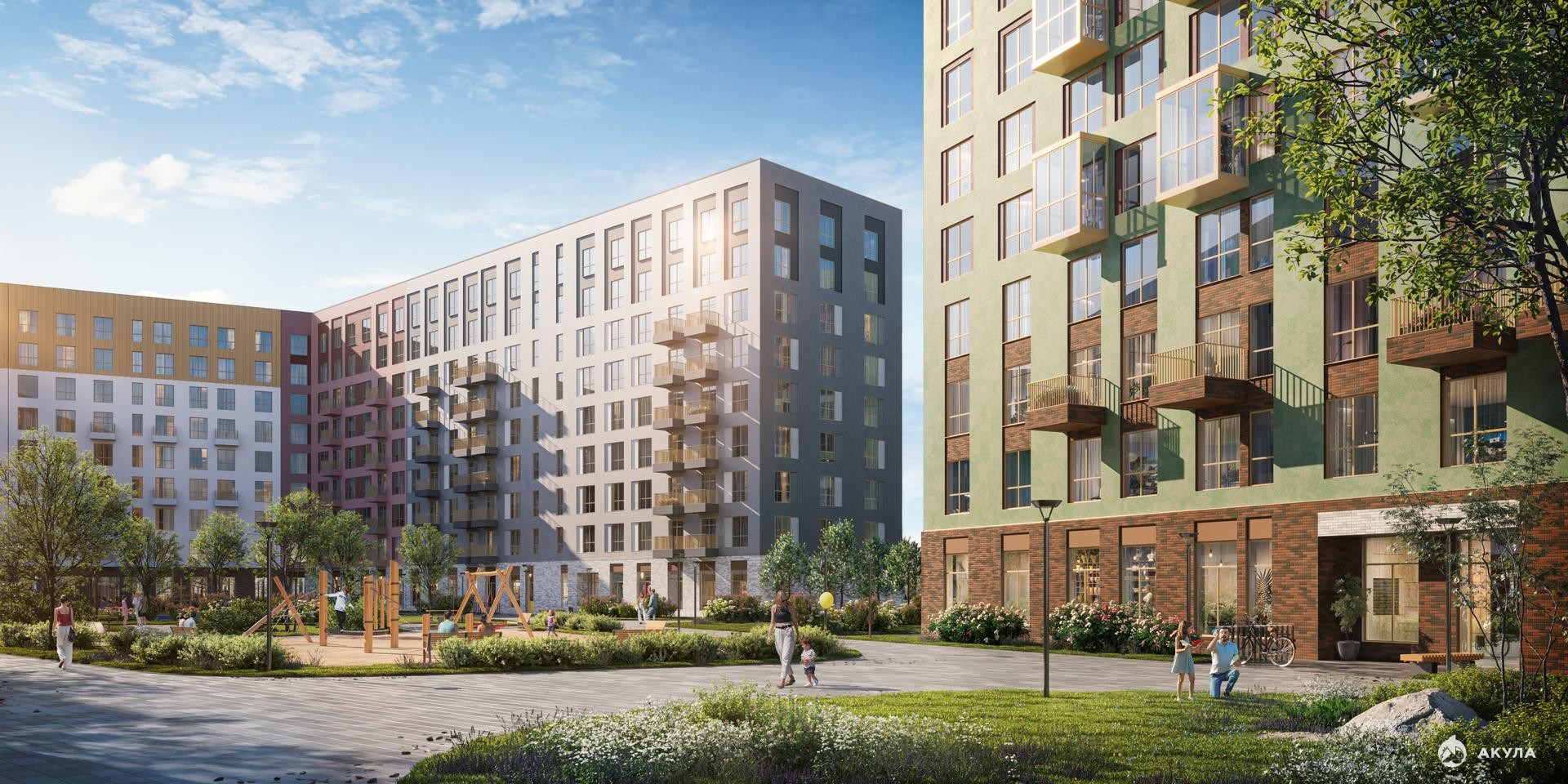 Дома высотой до 11 этажей с панорамными балконами выполнены в скандинавском стиле.