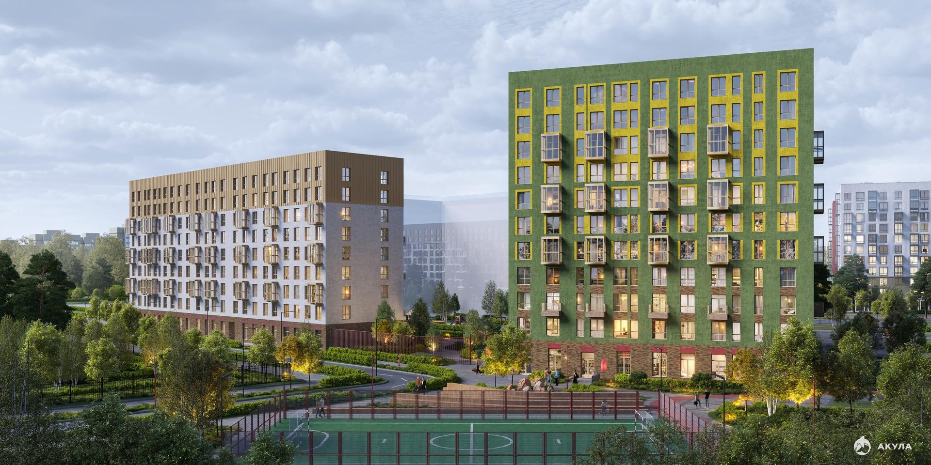 Дома высотой до 11 этажей с панорамными балконами выполнены в скандинавском стиле.