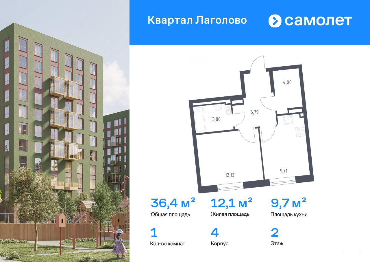 Предлагается 1-комнатная квартира комфорт-класса 36, 43 кв.м в корпусе 4 на 2 этаже, в ЖК «Квартал Лаголово»
