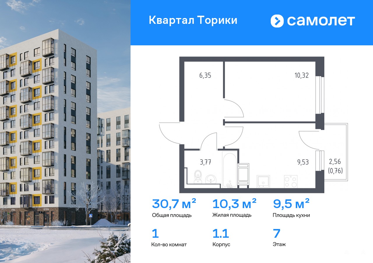 Строим кварталы для жизни с заботой о будущем. Предлагается 1-комнатная квартира комфорт-класса 30, 73 кв.м в корпусе 1.1 на 7 этаже, в ЖК «Квартал Торики»