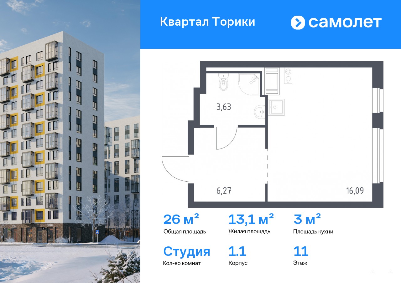 Строим кварталы для жизни с заботой о будущем. Предлагается квартира студия комфорт-класса 25, 99 кв.м в корпусе 1.1 на 11 этаже, в ЖК «Квартал Торики»