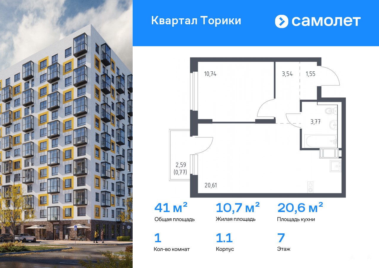 Строим кварталы для жизни с заботой о будущем. Предлагается 1-комнатная квартира комфорт-класса 40, 98 кв.м в корпусе 1.1 на 7 этаже, в ЖК «Квартал Торики»