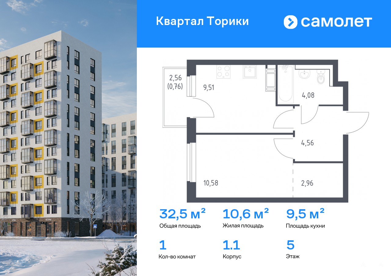Строим кварталы для жизни с заботой о будущем. Предлагается 1-комнатная квартира комфорт-класса 32, 45 кв.м в корпусе 1.1 на 5 этаже, в ЖК «Квартал Торики»