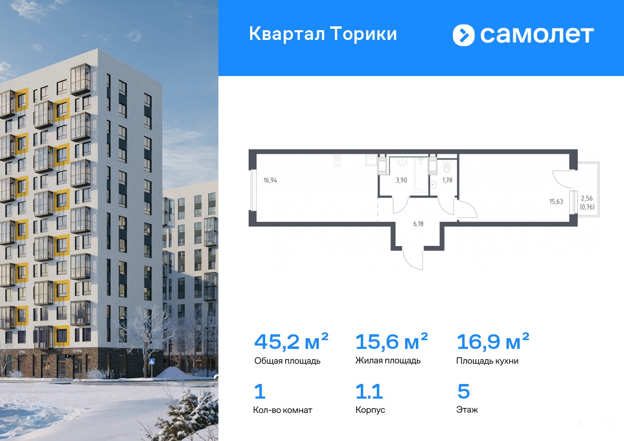 Строим кварталы для жизни с заботой о будущем. Предлагается 1-комнатная квартира комфорт-класса 45, 19 кв.м в корпусе 1.1 на 5 этаже, в ЖК «Квартал Торики»