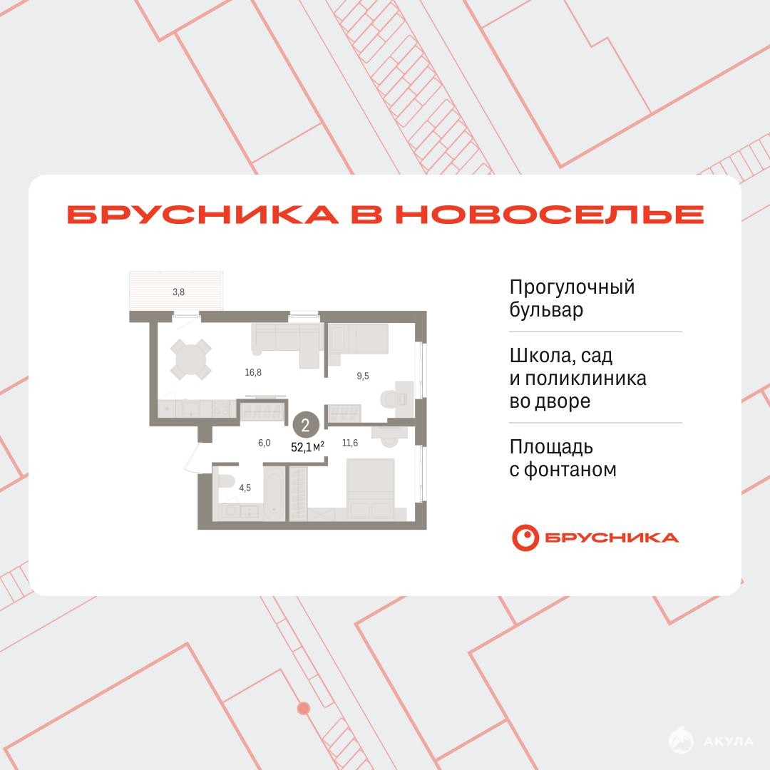 Продается 2-комн. квартира от застройщика с предчистовой отделкой в ЖК "Брусника в Новоселье" на 8 этаже. Общая площадь: 52.11 кв.м., жилая: 21.1 кв.м., площадь просторной кухни-столовой: 16.8 кв.м. Квартира угловая, окна oбecпeчивaют paвнoмepнoe ocвeщeниe в тeчeниe дня. В квартире один балкон, один совмещенный санузел. Высота потолков 2.7 м.