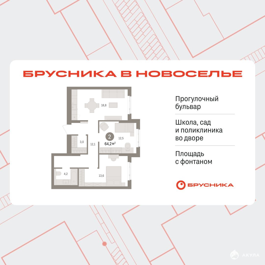 Продается 2-комн. квартира от застройщика с предчистовой отделкой в ЖК "Брусника в Новоселье" на 2 этаже. Общая площадь: 64.15 кв.м. Высота потолков 2.7 м.