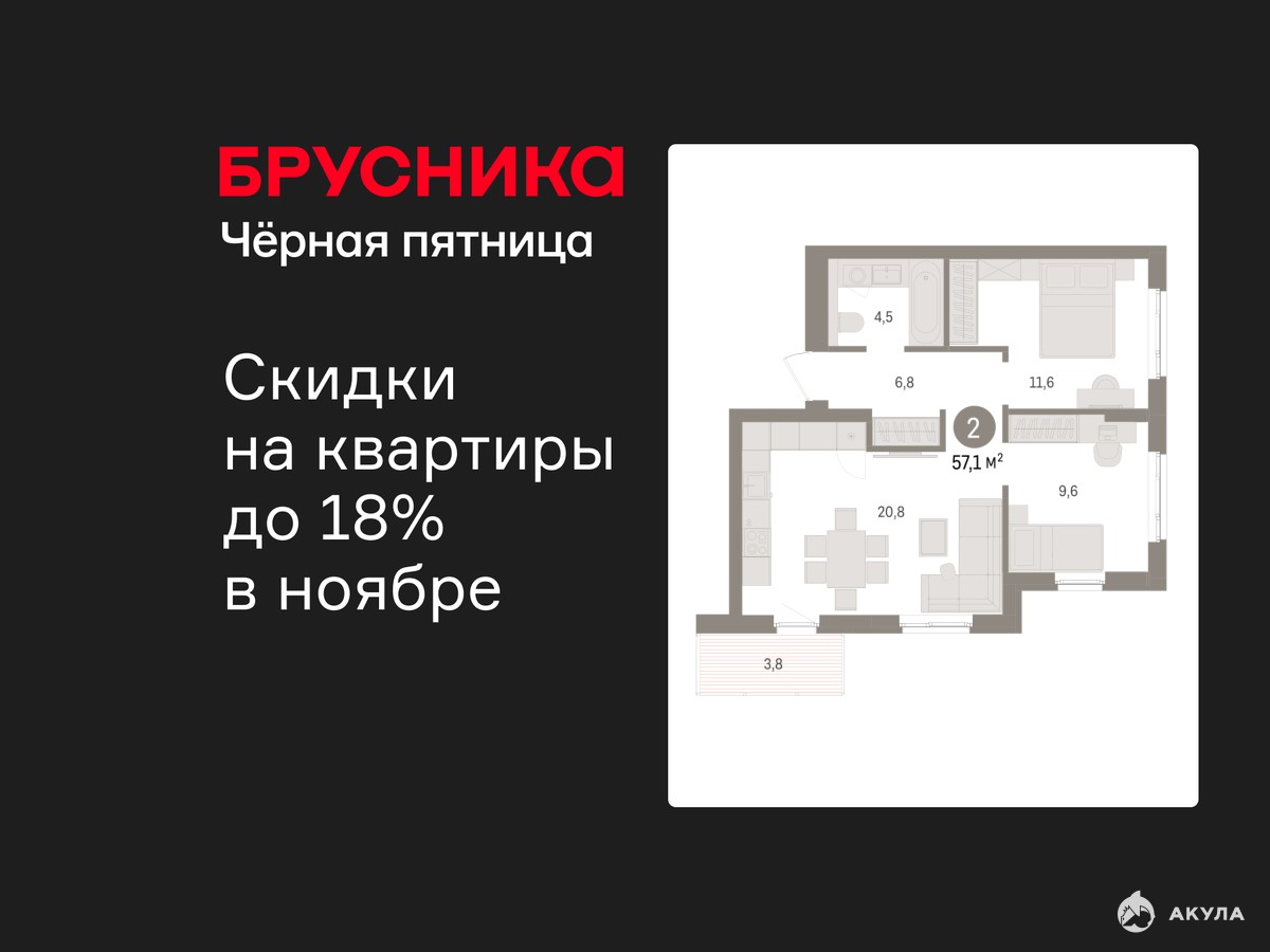 Продается двухкомнатная квартира от застройщика с предчистовой отделкой в ЖК "Брусника в Новоселье" на 8 этаже. Общая площадь: 57.07 кв.м., жилая: 21.2 кв.м., площадь просторной кухни-столовой: 20.8 кв.м. Квартира угловая, идеально подойдет любителям тишины и панорамных видов. В квартире один балкон, один совмещенный санузел. Высота потолков 2.7 м.
