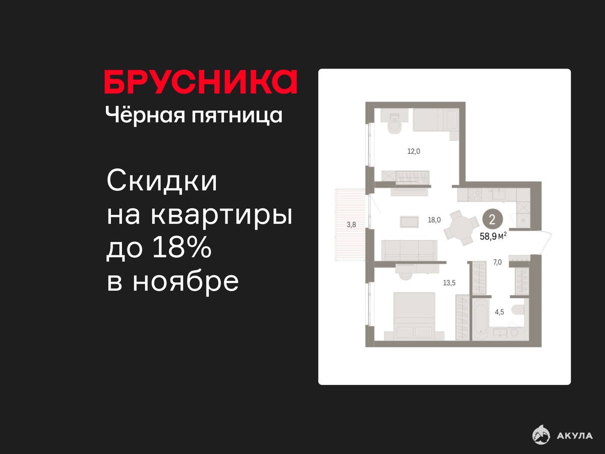 Двухкомнатная квартира от застройщика с предчистовой отделкой в ЖК "Брусника в Новоселье" на 8 этаже. Общая площадь: 58.85 кв.м., жилая: 25.5 кв.м., площадь просторной кухни-столовой: 18 кв.м. Комнаты изолированные, все окна выходят на одну сторону. В квартире один балкон, один совмещенный санузел. Высота потолков 2.7 м.