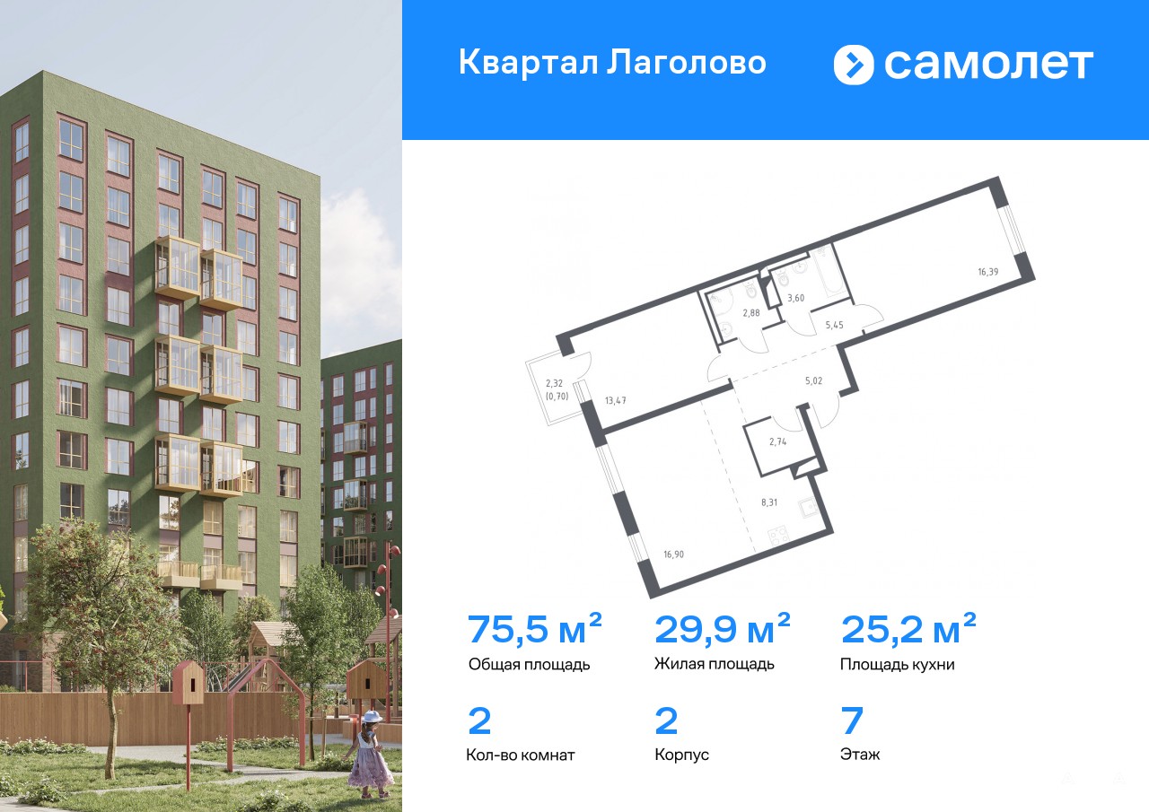 Строим кварталы для жизни с заботой о будущем. Предлагается 2-комнатная квартира комфорт-класса 75, 46 кв.м в корпусе 2 на 7 этаже, в ЖК «Квартал Лаголово»