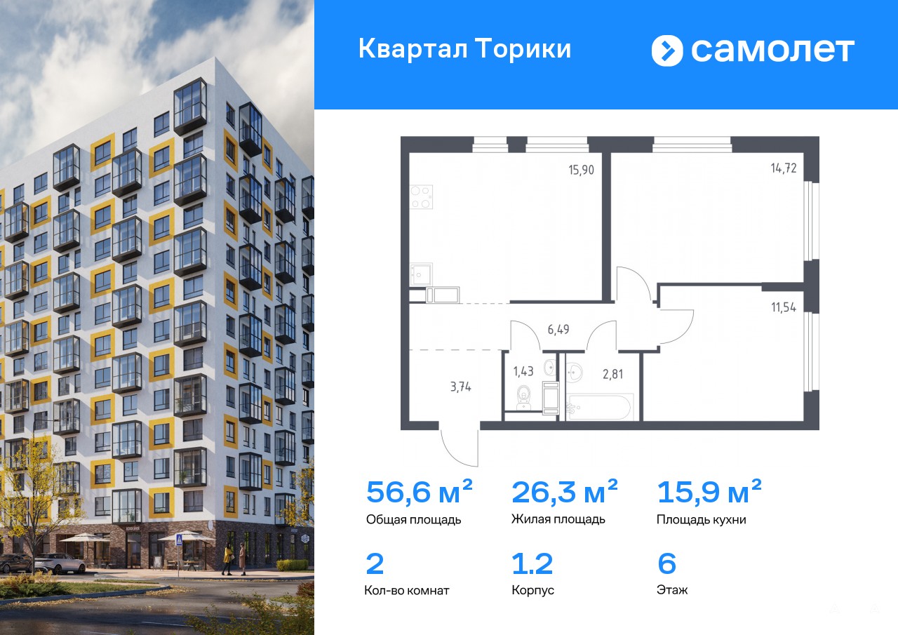 Строим кварталы для жизни с заботой о будущем. Предлагается 2-комнатная квартира комфорт-класса 56, 63 кв.м в корпусе 1.2 на 6 этаже, в ЖК «Квартал Торики»