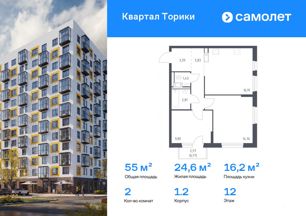 Строим кварталы для жизни с заботой о будущем. Предлагается 2-комнатная квартира комфорт-класса 54, 98 кв.м в корпусе 1.2 на 12 этаже, в ЖК «Квартал Торики»