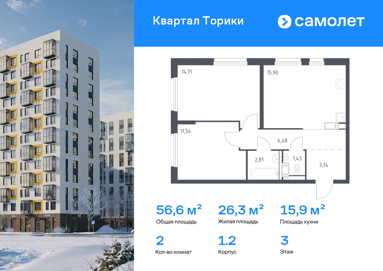 Строим кварталы для жизни с заботой о будущем. Предлагается 2-комнатная квартира комфорт-класса 56, 61 кв.м в корпусе 1.2 на 3 этаже, в ЖК «Квартал Торики»