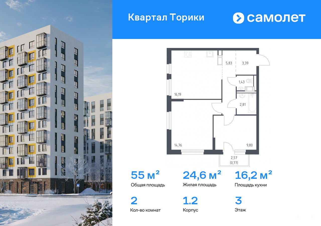 Строим кварталы для жизни с заботой о будущем. Предлагается 2-комнатная квартира комфорт-класса 54, 98 кв.м в корпусе 1.2 на 3 этаже, в ЖК «Квартал Торики»