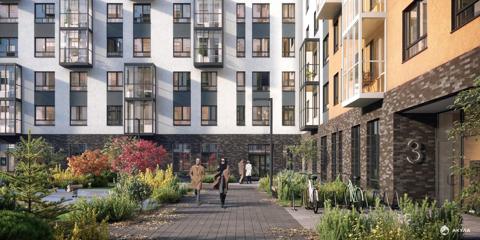 Современные монолитные дома высотой 12 этажей выполнены в нейтральной цветовой гамме с яркими акцентами.