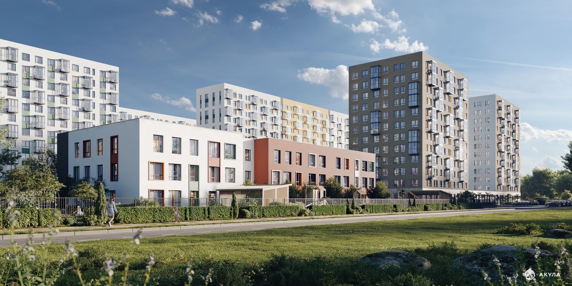 Современные монолитные дома высотой 12 этажей выполнены в нейтральной цветовой гамме с яркими акцентами.
