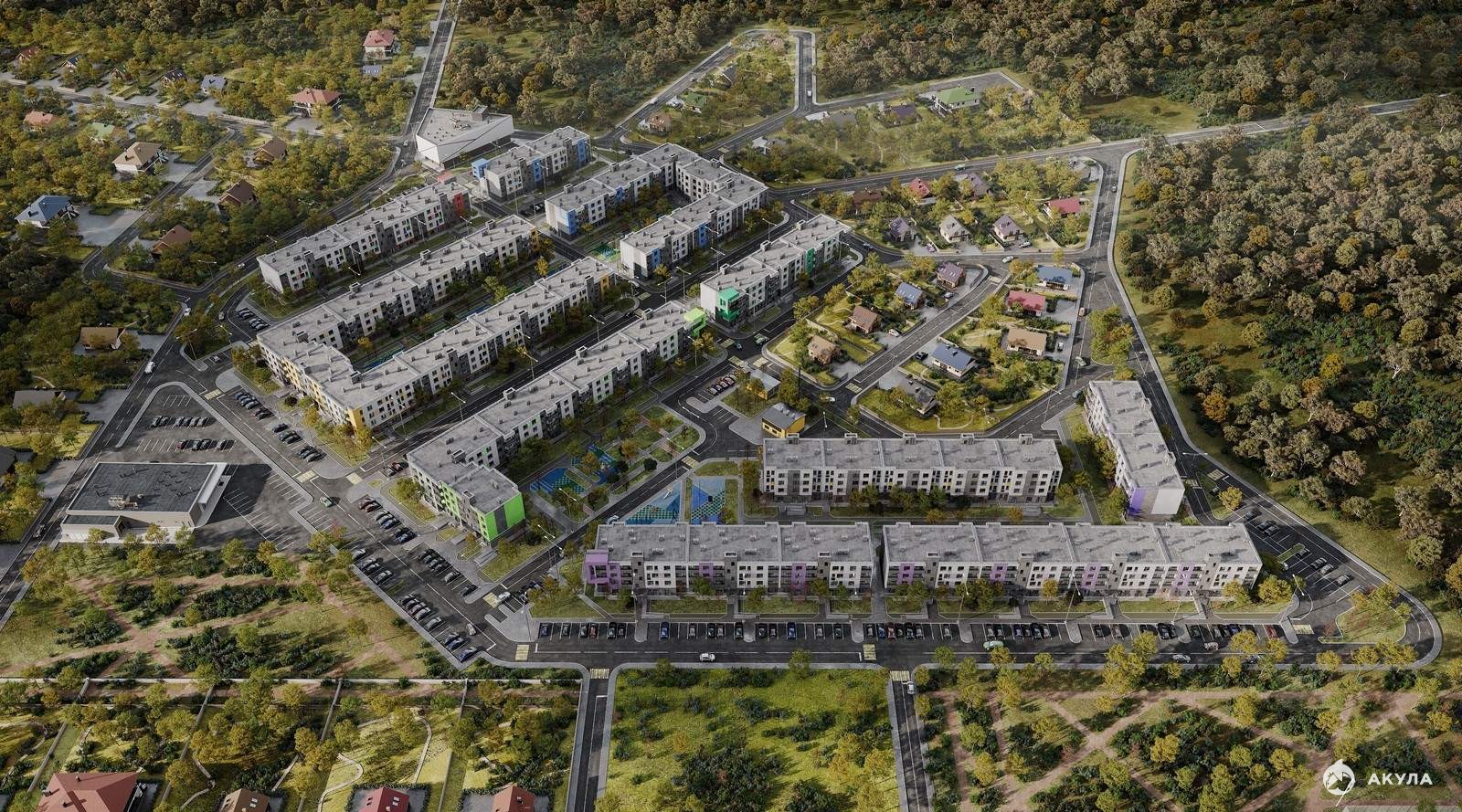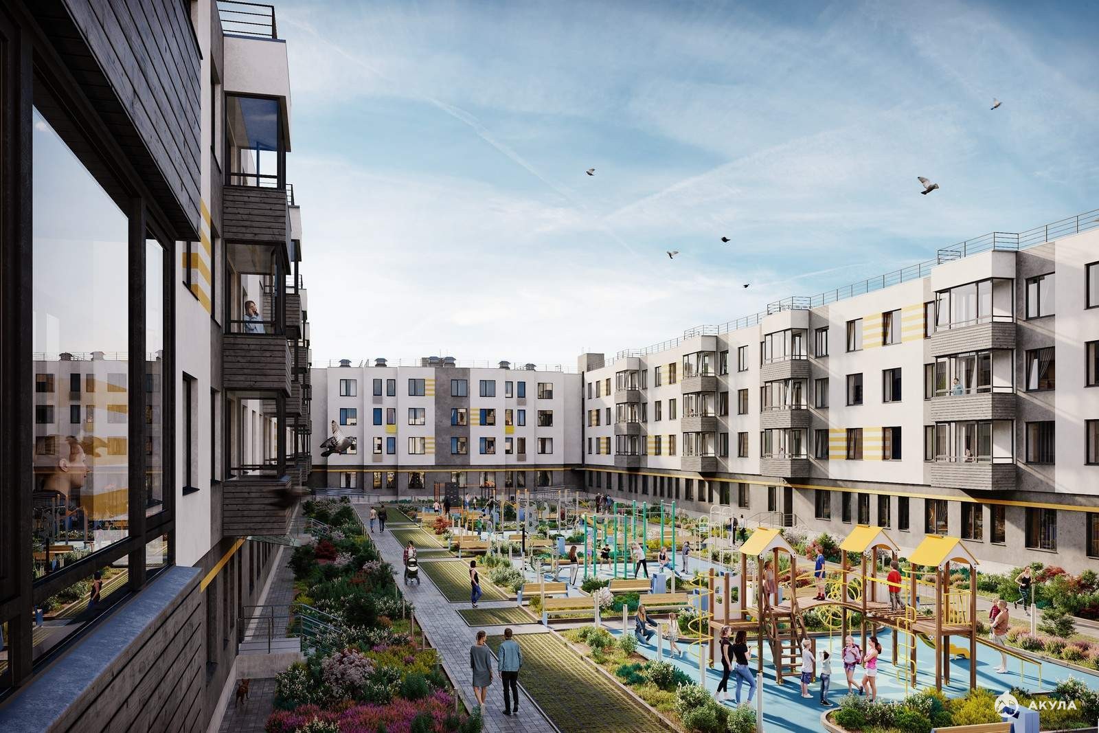 В 10-ти четырехэтажных корпусах сможет поселиться 1171 семья. Дома располагаются блоками, образуя уютные закрытые и безопасные дворы с большим количеством зеленых насаждений и с зонами отдыха для взрослых и детей.