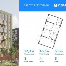Строим кварталы для жизни с заботой о будущем. Предлагается 3-комнатная квартира комфорт-класса 73, 34 кв.м в корпусе 4 на 3 этаже, в ЖК «Квартал Лаголово» Квартира без отделки. Доступность опции «отделка» и возможность комплектации мебелью и декором уточняйте у...