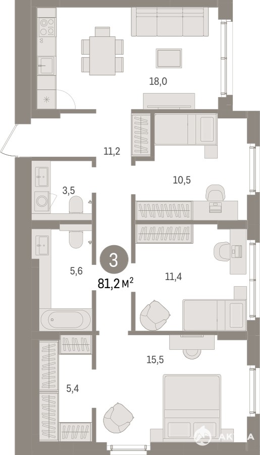 Трехкомнатная квартира от застройщика с предчистовой отделкой в ЖК "Брусника в Новоселье" на 1 этаже. Общая площадь: 81.22 кв.м. Высота потолков 2.7 м.