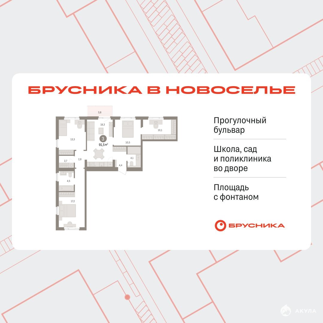 3-комн. квартира от застройщика с предчистовой отделкой в ЖК "Брусника в Новоселье" на 8 этаже. Общая площадь: 91.51 кв.м., жилая: 41 кв.м., площадь просторной кухни-столовой: 18.3 кв.м. Квартира без проходных комнат, окна выходят нa три cтopoны дома. В квартире один балкон, два совмещенных санузла. Высота потолков 2.7 м.