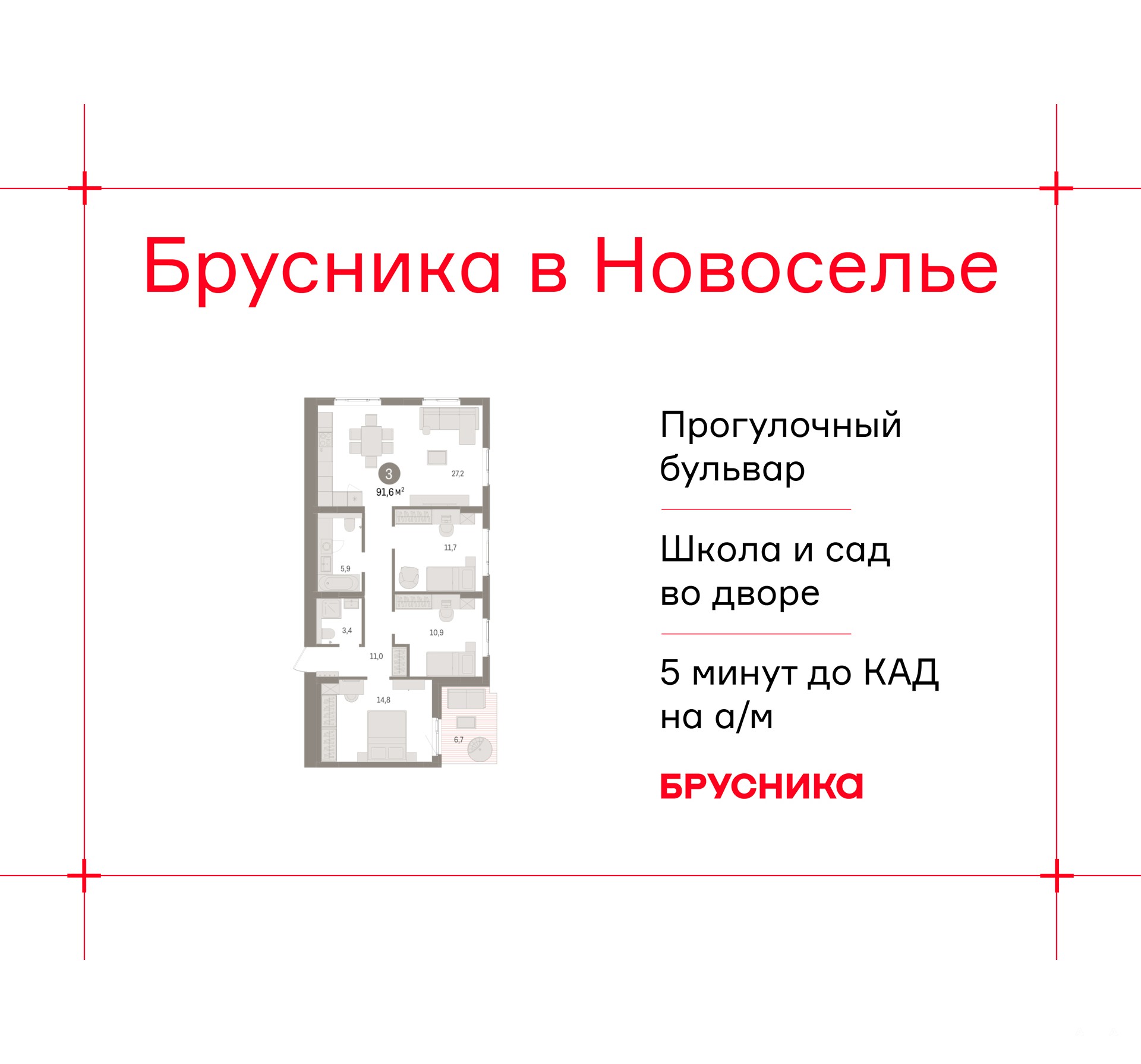 Продается 3-комн. квартира с предчистовой отделкой в ЖК "Брусника в Новоселье" на 9 этаже. Общая площадь: 91.58 кв.м. Высота потолков 2.7 м.
