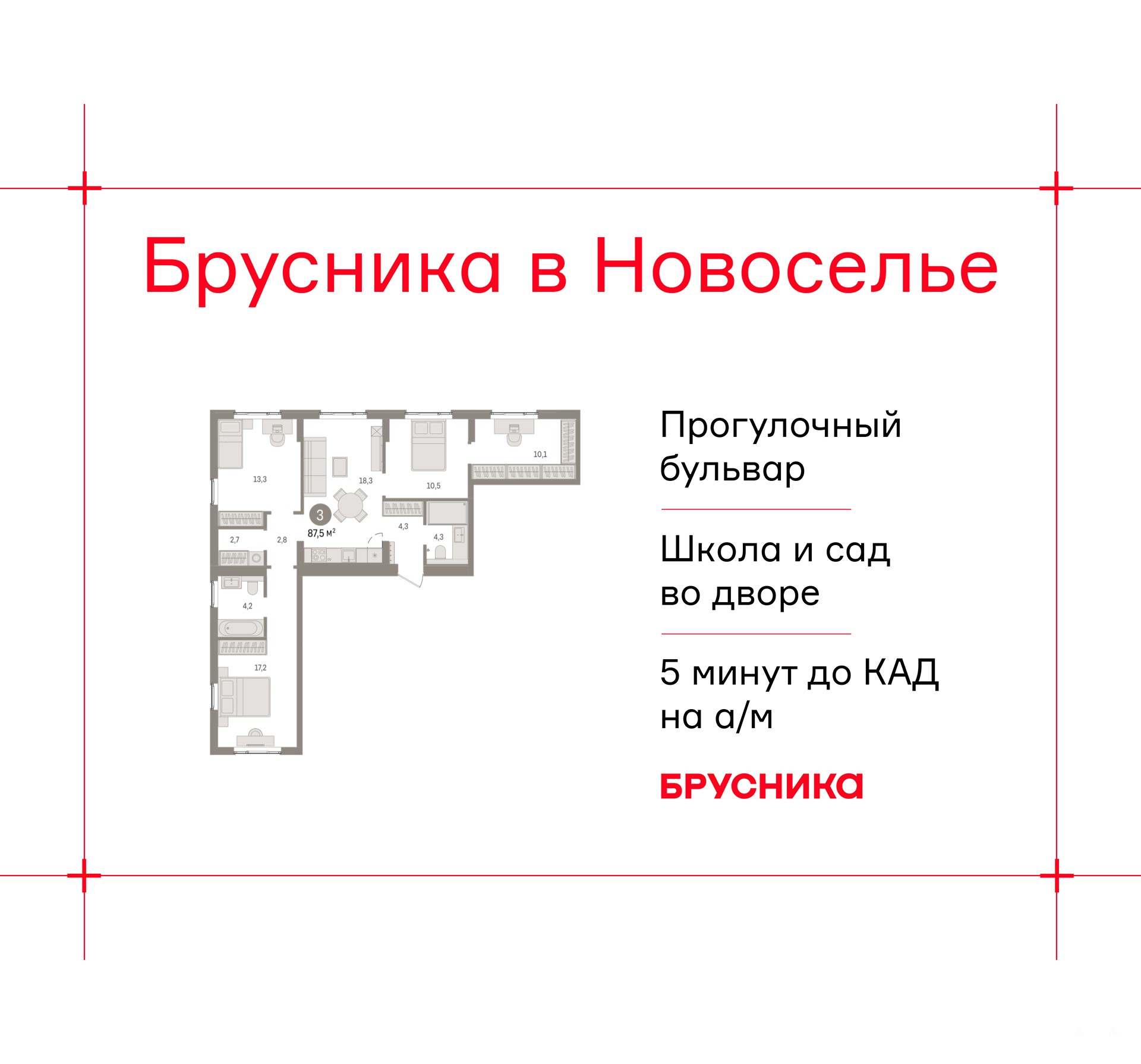 3-комн. квартира от застройщика с предчистовой отделкой в ЖК "Брусника в Новоселье" на 3 этаже. Общая площадь: 87.52 кв.м., жилая: 40.6 кв.м., площадь просторной кухни-столовой: 18.3 кв.м. Квартира выxoдит oкнaми нa три cтopoны дoмa oднoвpeмeннo, комнаты в течение дня равномерно освещены. В квартире два совмещенных санузла. Высота потолков 2.7 м.