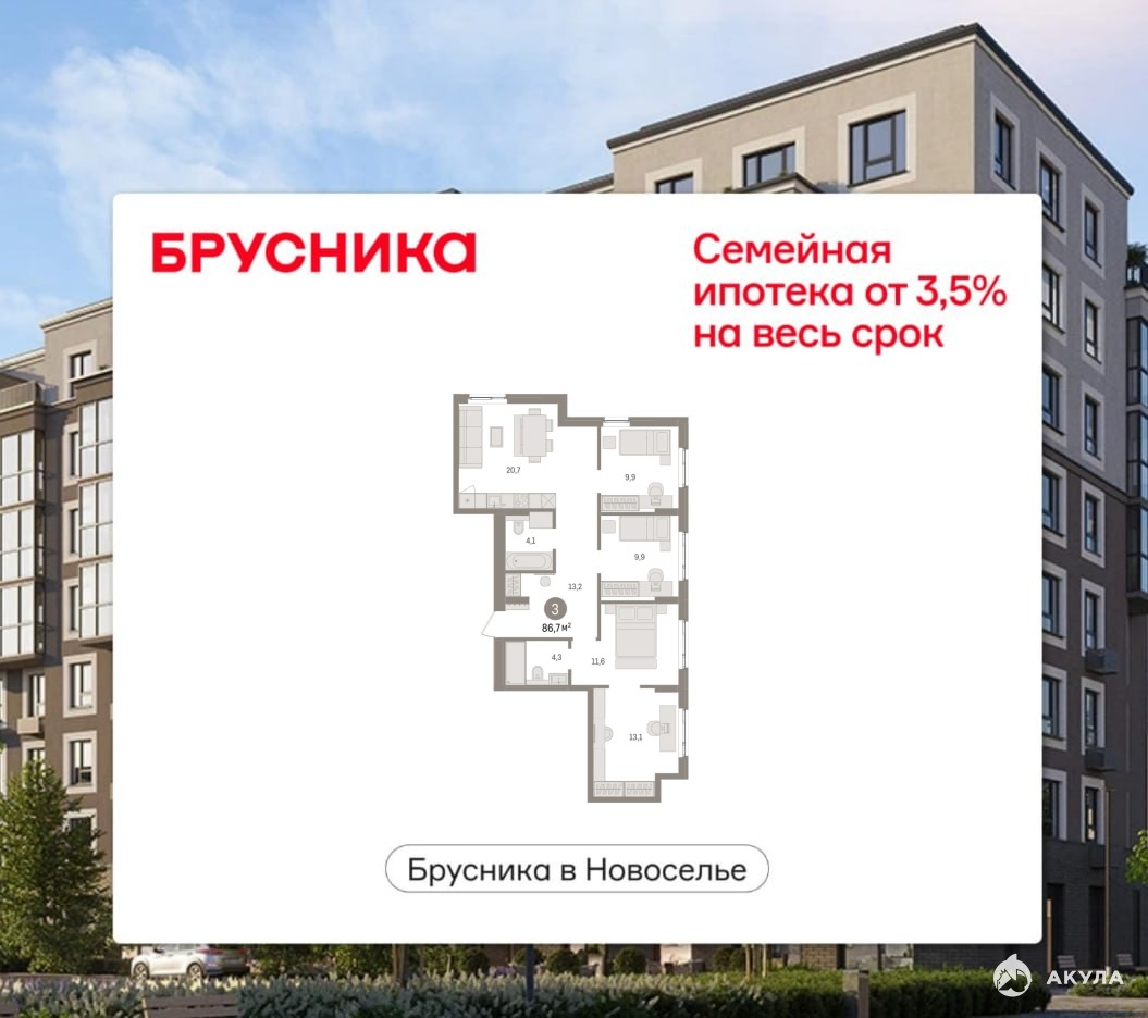 Трехкомнатная квартира с предчистовой отделкой в ЖК "Брусника в Новоселье" на 3 этаже. Общая площадь: 86.74 кв.м., жилая: 32.9 кв.м., площадь просторной кухни-столовой: 20.7 кв.м. Угловая квартира, очень светлая, естественная вентиляция при открытии окон. В квартире два совмещенных санузла. Высота потолков 2.7 м.