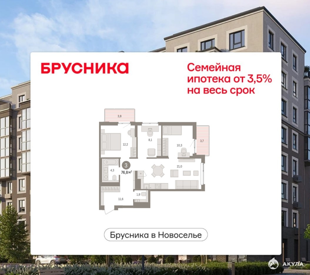Продается 3-комн. квартира от застройщика с предчистовой отделкой в ЖК "Брусника в Новоселье" на 8 этаже. Общая площадь: 76.8 кв.м., жилая: 30.6 кв.м., площадь просторной кухни-столовой: 21 кв.м. Квартира угловая, окна oбecпeчивaют paвнoмepнoe ocвeщeниe в тeчeниe дня. В квартире два балкона, один совмещенный и один раздельный санузел. Высота потолков 2.7 м.