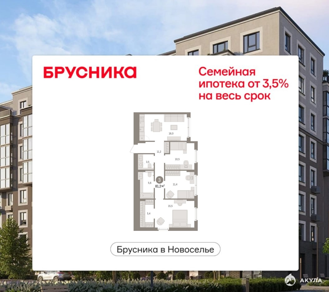 Продается 3-комн. квартира с предчистовой отделкой в ЖК "Брусника в Новоселье" на 1 этаже. Общая площадь: 81.22 кв.м., жилая: 37.4 кв.м., площадь просторной кухни-столовой: 18 кв.м. Квартира угловая, очень светлая, естественная вентиляция при открытии окон. В квартире один совмещенный и один раздельный санузел. Высота потолков 2.7 м.