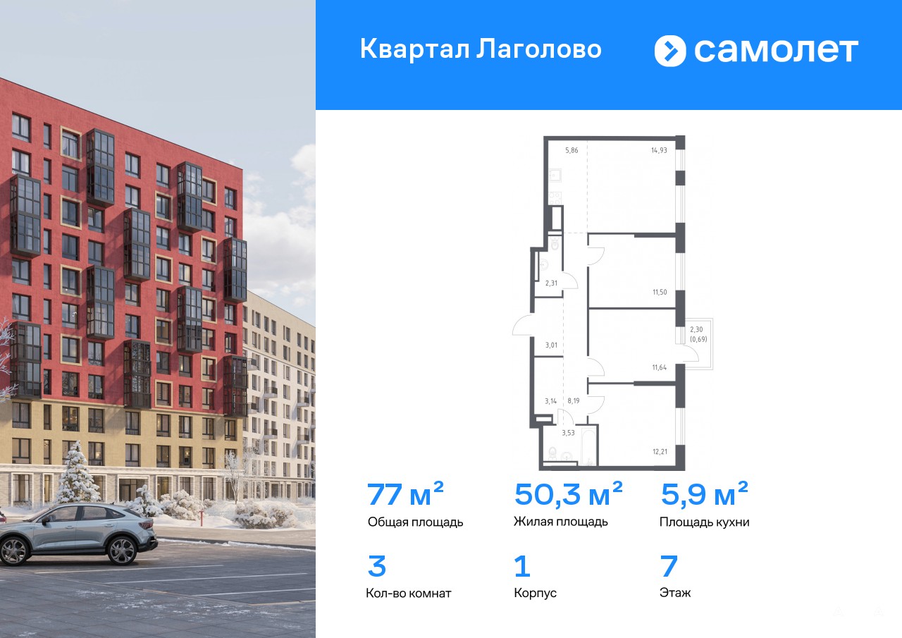 Строим кварталы для жизни с заботой о будущем. Предлагается 3-комнатная квартира комфорт-класса 77, 01 кв.м в корпусе 1 на 7 этаже, в ЖК «Квартал Лаголово»
