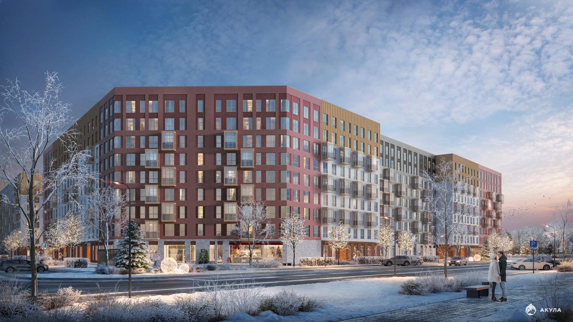 Дома высотой до 11 этажей с панорамными балконами выполнены в скандинавском стиле.