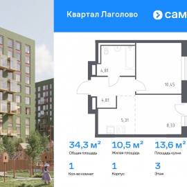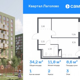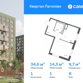 Строим кварталы для жизни с заботой о будущем. Предлагается 1-комнатная квартира комфорт-класса 34, 56 кв.м в корпусе 1 на 8 этаже, в ЖК «Квартал Лаголово» Квартира с предчистовой отделкой. Доступность дополнительных опций уточняйте у застройщика. Приобрести квартиру...